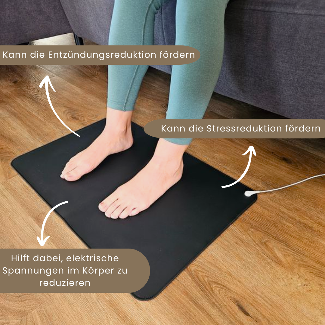 Durch die leitfähige Erdungsmatte oder das leitfähige Erdungs Spannbetttuch bleibt dein Körper in direktem, physischen Kontakt mit der Erde, vergleichbar mit dem Barfußlaufen am Strand. Dabei kann überschüssige Körperspannung abgeleitet werden, während freie Elektronen aus der Erdoberfläche in den Körper übergehen und dort zu einem natürlichen Ausgleich beitragen können.