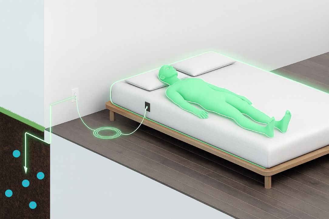 Schon beim ersten Kontakt mit einer geerdeten Schlafauflage sinkt die elektrische Körperspannung schlagartig – messbar innerhalb von Sekunden. Dadurch wird die Belastung durch elektrische Fremdspannungen aus der Umgebung stark reduziert.
